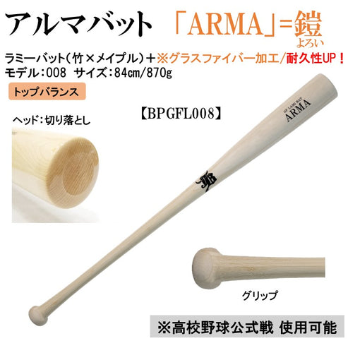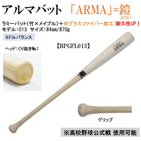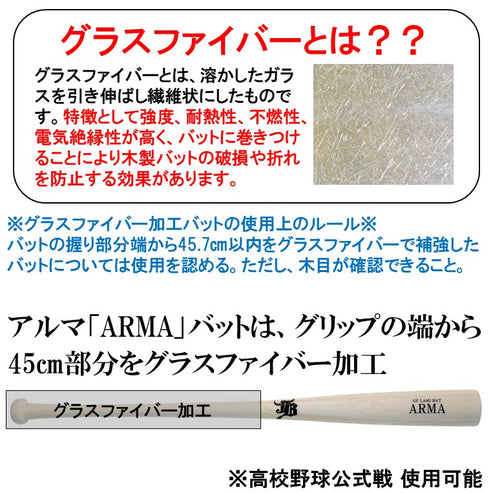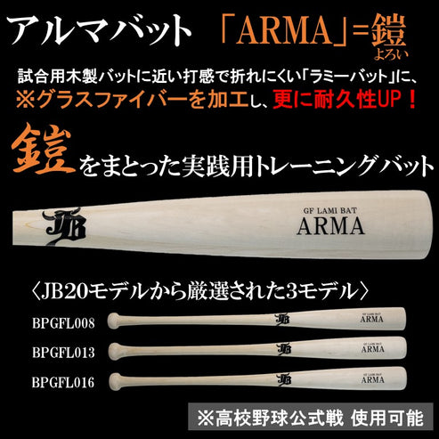 BFJ試合用木製バットに近い打感のラミー(竹×メイプル)素材を採用。アルマ-ARMA-とは「鎧(よろい)」という意味も持ち、グラスファイバー加工を行うことで強度・耐久性がアップしております。実践向けのトレーニングバットとして最適、中学・高校・大学生にオススメです。